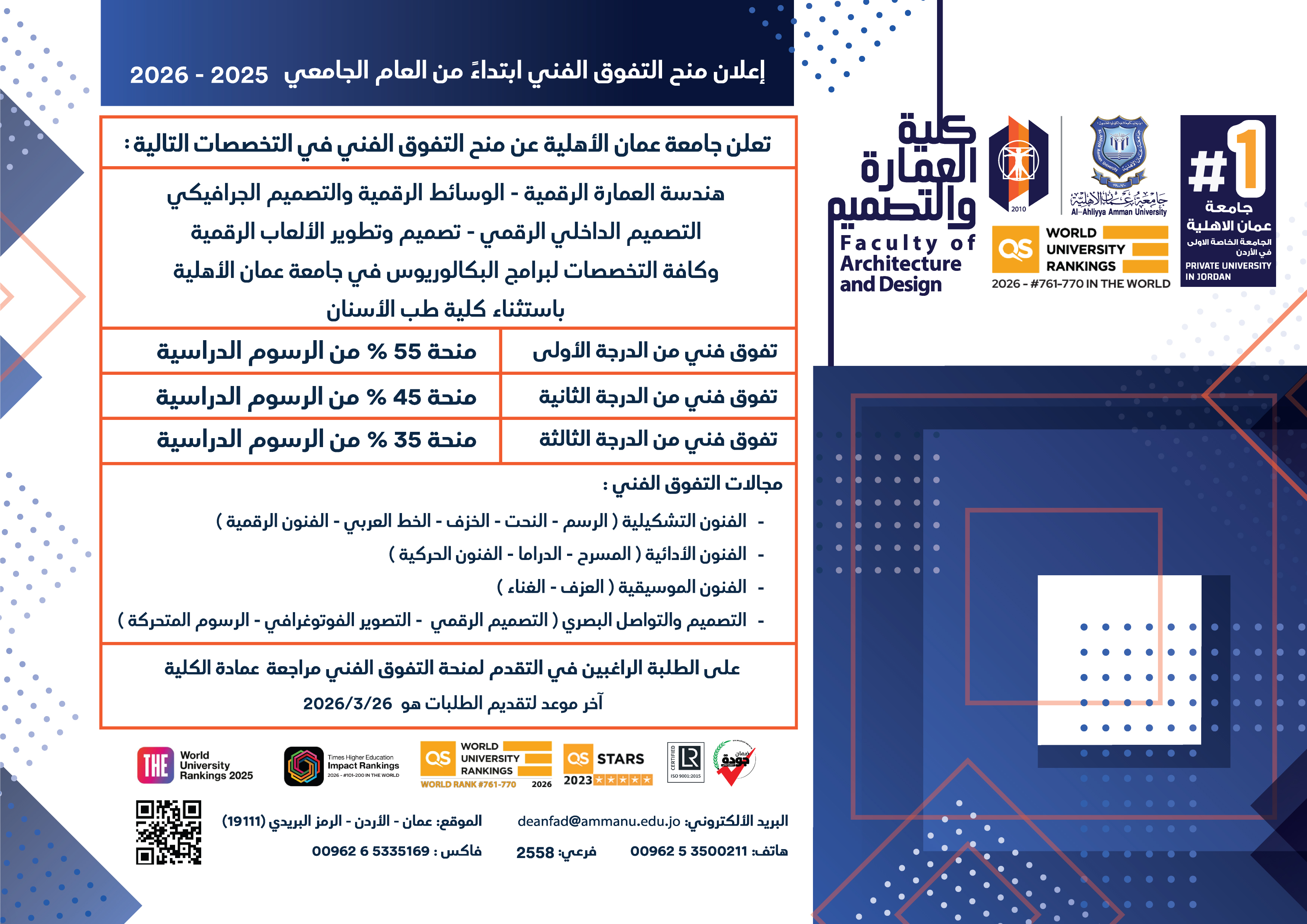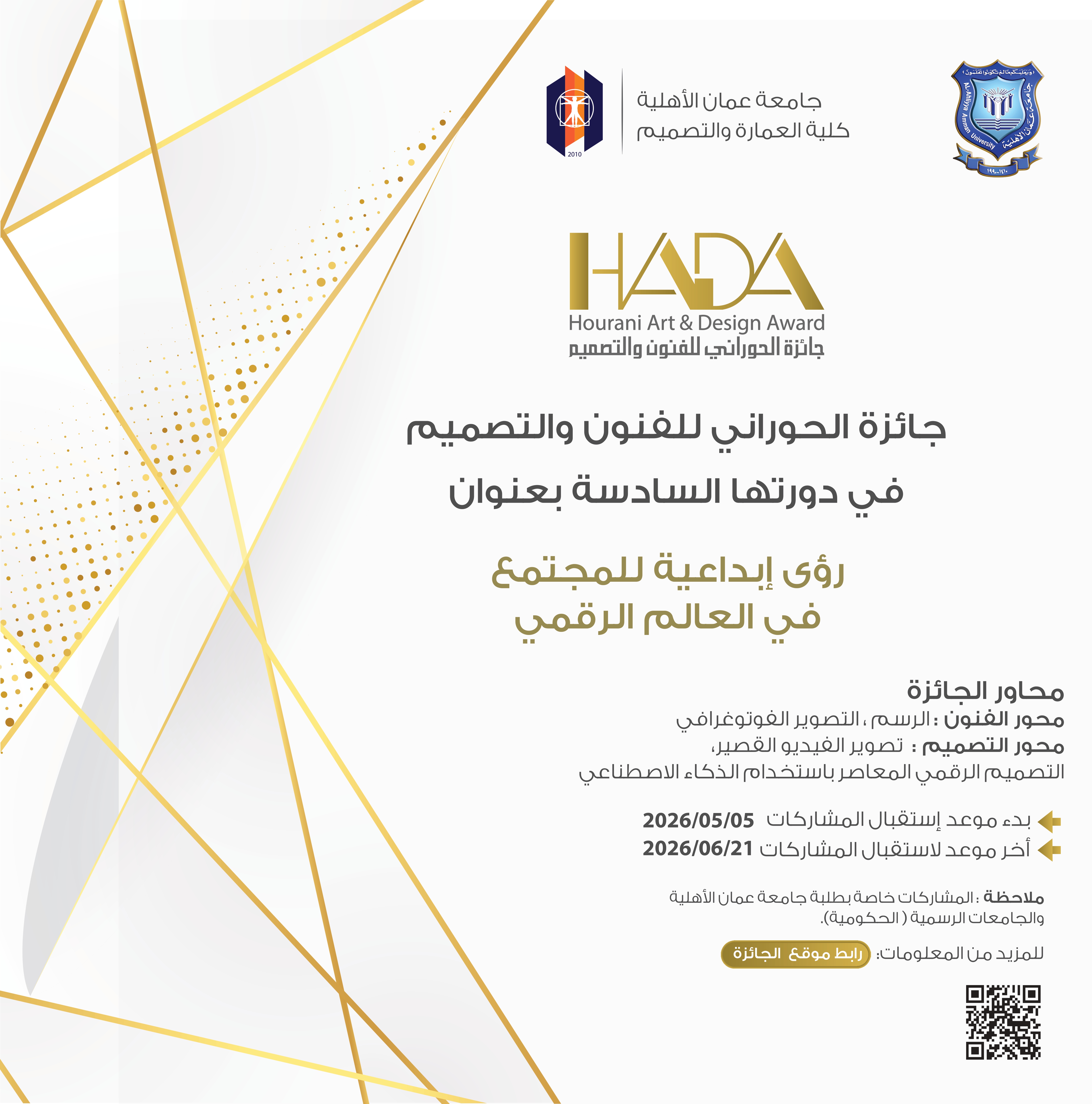 With its renewed structure, the Faculty of Architecture and Design stands as a distinguished cultural and academic landmark, alive with modernity and contemporary vision. It weaves the depth of history and the heritage of the past into a forward-looking future, offering pioneering contributions to the contemporary Jordanian and Arab artistic movement through its four departments: Architecture, Interior Design, Cinematic, Television, and Theatrical Design, and Multimedia and Graphic Design. The Faculty aspires to lead among its peer institutions by shaping the…